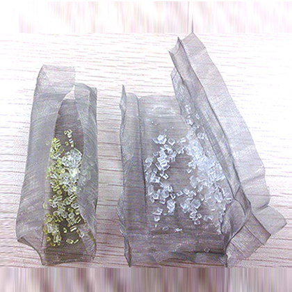 取膠膜一塊,將鐵弗龍布/EVA膜/EVA膜/鐵弗龍布(或TPT/膠膜/膠膜/玻璃)疊合后,按平時一次固化工藝固化交聯(lián)(或按廠家工藝要求固化交聯(lián)),將已交聯(lián)過的EVA膠樣(在不同部位取樣),用剪刀剪成小碎片,在1/10000電子天平式準確稱取試樣0.1450~0.1500g(準確到0.0001g),將樣品放入已知重量的120目不銹鋼網袋里,稱取重量(袋和試樣)為(W2)。